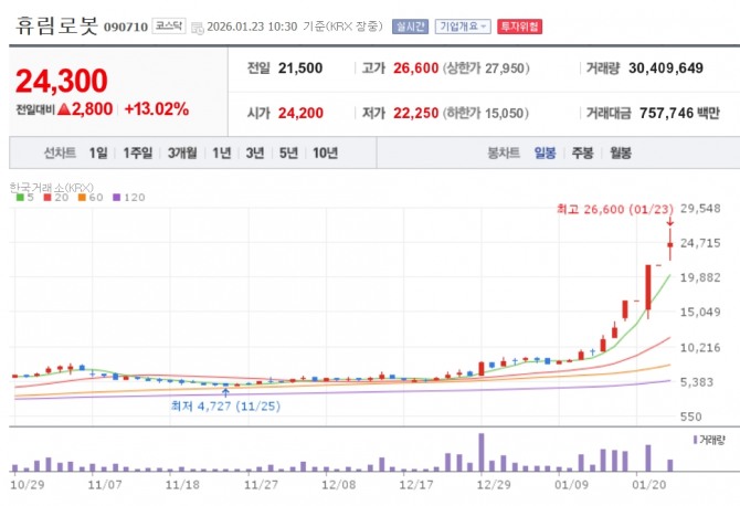 이미지 확대보기23일 한국거래소에 따르면 이날 오전 10시30분 기준 휴림로봇은 전 거래일 대비 13.02% 오른 2만4300원 거래되고 있다. 이밖에도 원익, 제닉스로보틱스, 에브리봇, 전진건설로봇 등 로보틱스 관련 사업을 영위하는 종목들이 상승세를 보이고 있다.