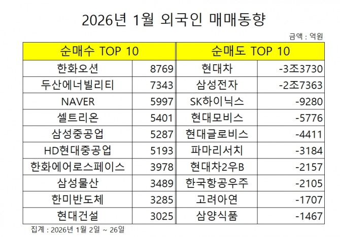 외국인 순매수 상위 종목을 보면 업종별 선호도 변화가 극명하게 드러난다. 1월 들어 외국인이 가장 많이 산 종목은 한화오션(8700억 원)이었다. 이어 두산에너빌리티(7300억 원), NAVER(6000억 원), 셀트리온(5400억 원), 삼성중공업(5300억 원), HD현대중공업(5200억 원) 순이었다.