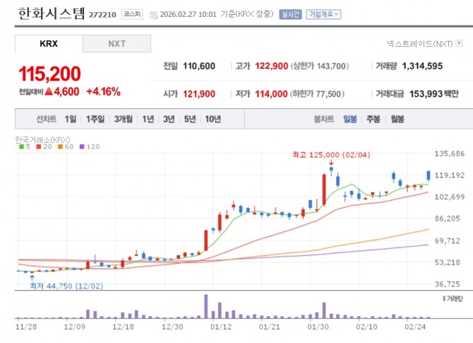 이미지 확대보기26일 한국거래소에에 따르면 한화시스템은 이날 오전 10시 01분 현재 전 거래일 대비 4.16% 오른 11만 5200원에 거래되고 있다. 한국항공우주는 3.64% 오른 19만 600원, LIG넥스원은 3.38% 오른 52만원에 거래 중이다. 이외에도 현대로템(2.50%), 한화에어로스페이스(1.34%) 등도 강세다.