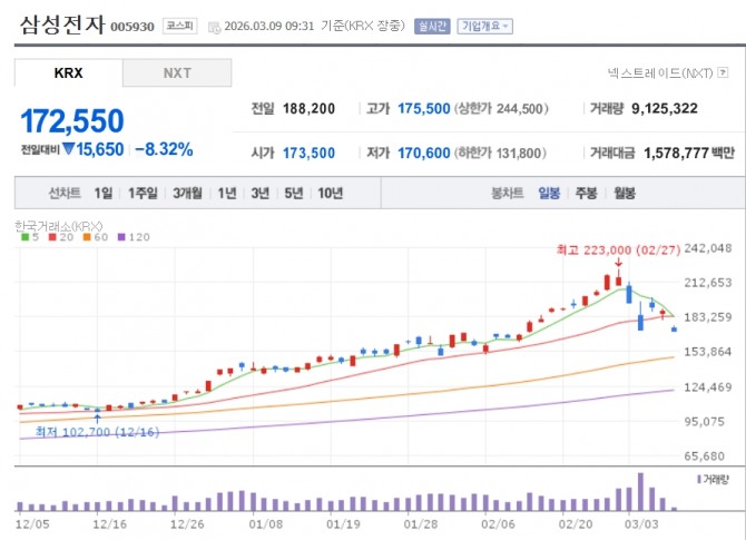 이미지 확대보기9일 한국거래소에 따르면 오전 9시31분 현재 삼성전자는 전 거래일 대비 8.32% 내린 17만2550원을 나타내고 있다. SK하이닉스는 8.01% 하락한 85만원에 거래되고 있다.
