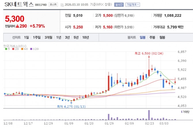 이미지 확대보기10일 한국거래소에 따르면 SK네트웍스는 이날 오전 10시 05분 기준 전 거래일 대비 5.79% 오른 5300원에 거래되고 있다.