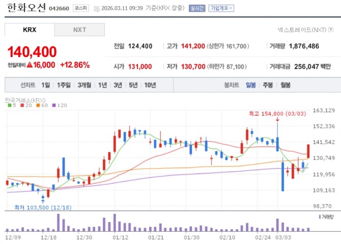 11일 한국거래소에 따르면 이날 오전 9시39분 기준 한화오션은 전 거래일 대비 12.86% 오른 14만400원에 거래되고 있다.