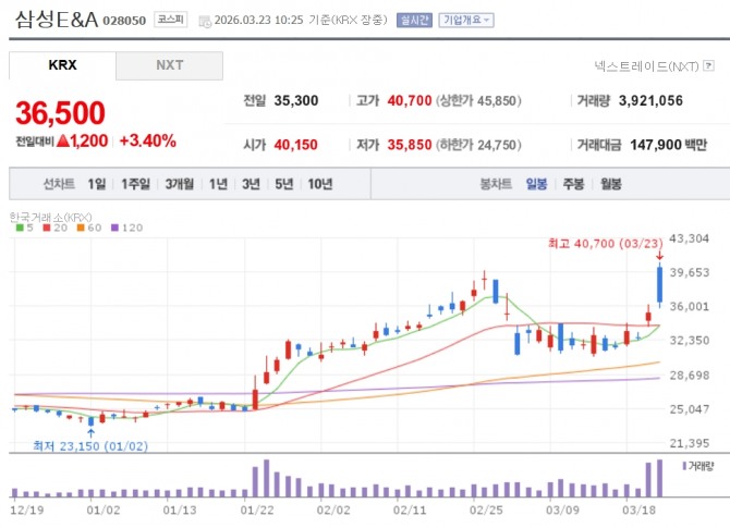 이미지 확대보기23일 한국거래소에 따르면 오전 10시 25분 기준 현재 전 거래일 대비 3.40% 오른 3만 6500원에 거래되고 있다.