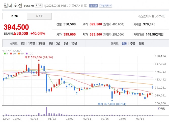 이미지 확대보기26일 한국거래소에 따르면 알테오젠은 이날 오전 9시 51분 기준으로 전 거래일 대비 10.04% 오른 39만 4500원에 거래되고 있다.