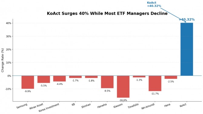 중위권 운용사인 KB자산운용(RISE)과 신한자산운용(SOL)은 이번 하락장에서 점유율을 각각 0.38%, 0.22% 높이며 내실을 다졌다.