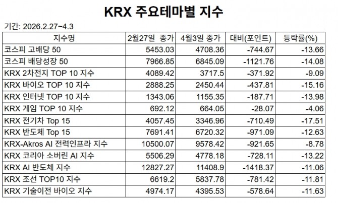 전반적인 하락장 속에서도 상대적으로 매를 덜 맞은 '버티기' 테마도 존재했다. 'KRX 게임 TOP 10' 지수는 -4.06%로 한 자릿수 하락에 그치며 가장 강한 하방 경직성을 보여줬다.