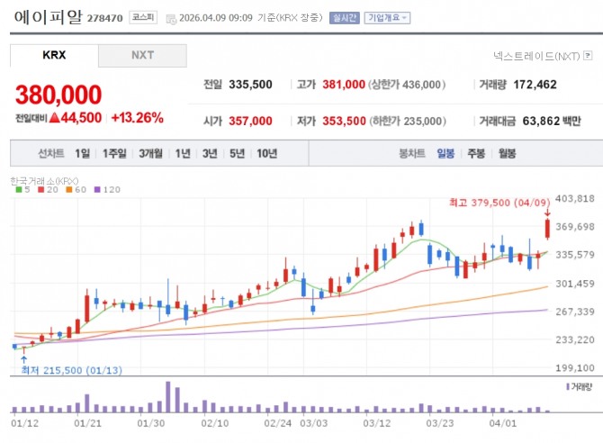 이미지 확대보기9일 한국거래소에 따르면 이날 오전 9시 9분 기준 에이피알은 전 거래일 대비 13.26% 오른 38만원에 거래되고 있다.