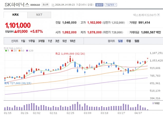 이미지 확대보기14일 한국거래소에 따르면 SK하이닉스는 오전 9시 23분 현재 전장보다 5.87% 오른 110만1000원에 거래되고 있다. 삼성전자는 전장보다 2.49% 오른 20만6000원에 매매되고 있다.