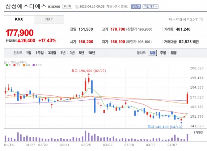 이미지 확대보기15일 한국거래소에 따르면 오전 9시 38분 기준 삼성SDS는 전 거래일 대비 17.43% 오른 17만7900원에 거래되고 있다.