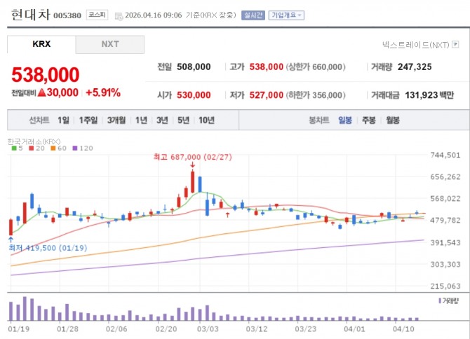 이미지 확대보기16일 한국거래소에 따르면 이날 오전 9시 6분 기준 현대차는 전 거래일 대비 5.91% 오른 53만8000원에 거래되고 있다.