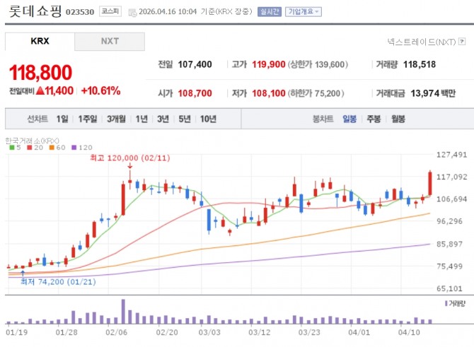16일 한국거래소에 따르면 오전 10시4분 현재 롯데쇼핑은 전 거래일 대비 10.61% 오른 11만8800원에 거래 중이다. 지난 2월11일 경신한 52주 신고가인 12만원의 턱밑까지 올랐다. 신세계(6.51%)(, 현대백화점(5.59%)도 동반 상승 중이다.