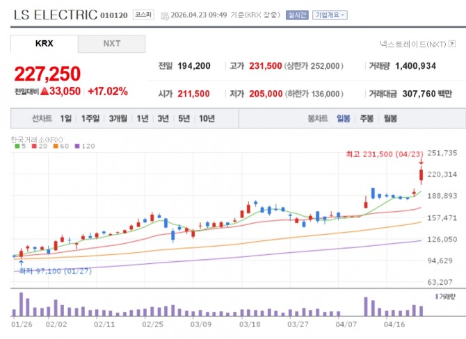 이미지 확대보기23일 한국거래소에 따르면 LS일렉트릭은 이날 오전 9시 49분 전일 대비 17.02% 오른 22만 7250원에 거래중이다. 장중 한때 23만1500원을 터치하며 신고가를 갈아 치웠다.