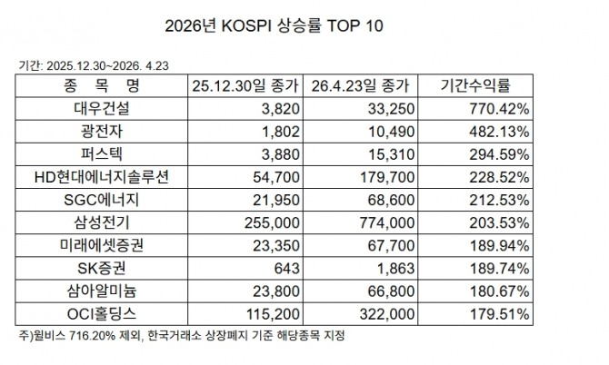 그는 이어 "상승률 1위 대우건설이 보여준 원전 시공력과 중동 재건 기대감은 K-인프라의 세계적 경쟁력을 상징한다"며 "투자자들은 이제 막연한 테마를 넘어 OCI홀딩스나 삼성전기처럼 글로벌 빅테크와 직접적인 공급망 동맹을 맺고 실질적인 숫자를 만들어내는 '혁신주'를 중심으로 포트폴리오를 재편해야 한다"고 조언했다.