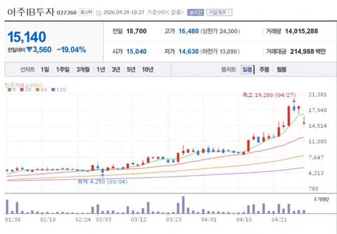 이미지 확대보기29일 한국거래소에 따르면 오전 10시27분 기준 아주IB투자는 전 거래일 대비 19.04% 내린 1만5140원에 거래되고 있다.