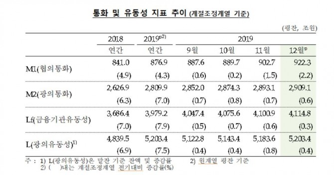 이미지 확대보기한국은행이 14일 발표한 '2019년 12월 중 통화 및 유동성'에 따르면 지난 12월 중 시중 통화를 의미하는 시중통화량(M2, 평잔·원계열 기준)은 2912조4341억 원으로 지난해보다 7.9% 증가했다. 계절조정기준(평잔)으로는 전월 대비 0.6% 늘어난 2909조1393억 원을 기록했다.