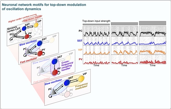 이미지 확대보기"뇌 주파수 변조 현상을 일으키는 핵심 구조는 흥분성 뉴런·소마토스타틴(SST) 억제성 뉴런·혈관작용-장(腸) 펩티드(VIP) 억제성 뉴런으로 이루어진 중첩된 양성 및 음성 피드백(interlinked positive and negative feedback) 회로다."