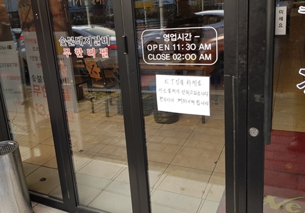 이미지 확대보기당장 이날 서대문구 음식점 등에서는 점포 입구에 “KT건물 화재로 카드결제가 안되고 있습니다. 현금이나 계좌이체 됩니다”라는 안내문을 쓰고 손님을 받는 매장들이 눈에 띠었다.
