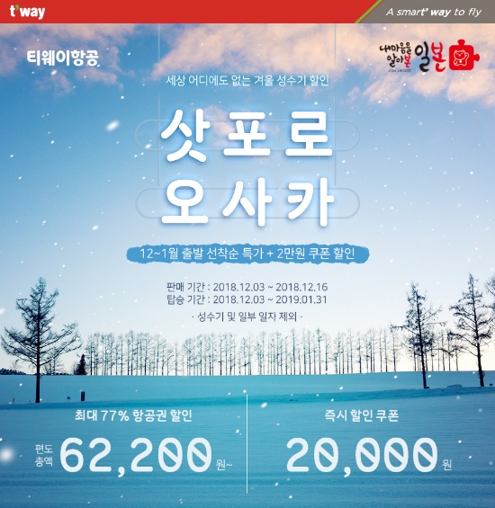 ◇티웨이항공, 겨울여행의 최적지 삿포로·오사카 특가 시행