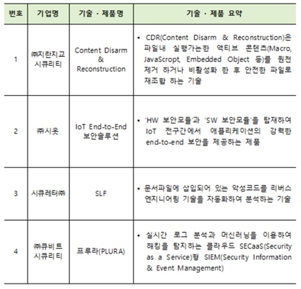 이미지 확대보기우수 정보보호 기술·제품 지정은 혁신기술을 개발한 우수 벤처기업을 지정해 중점 육성하기 위해 올해 첫 지정하게 됐다. 지정공모는 총 13개 기술·제품이 참여해 신규성, 독창성, 사업화 가능성 등의 심사를 통해 총 4개의 우수 기술을 선정했다.