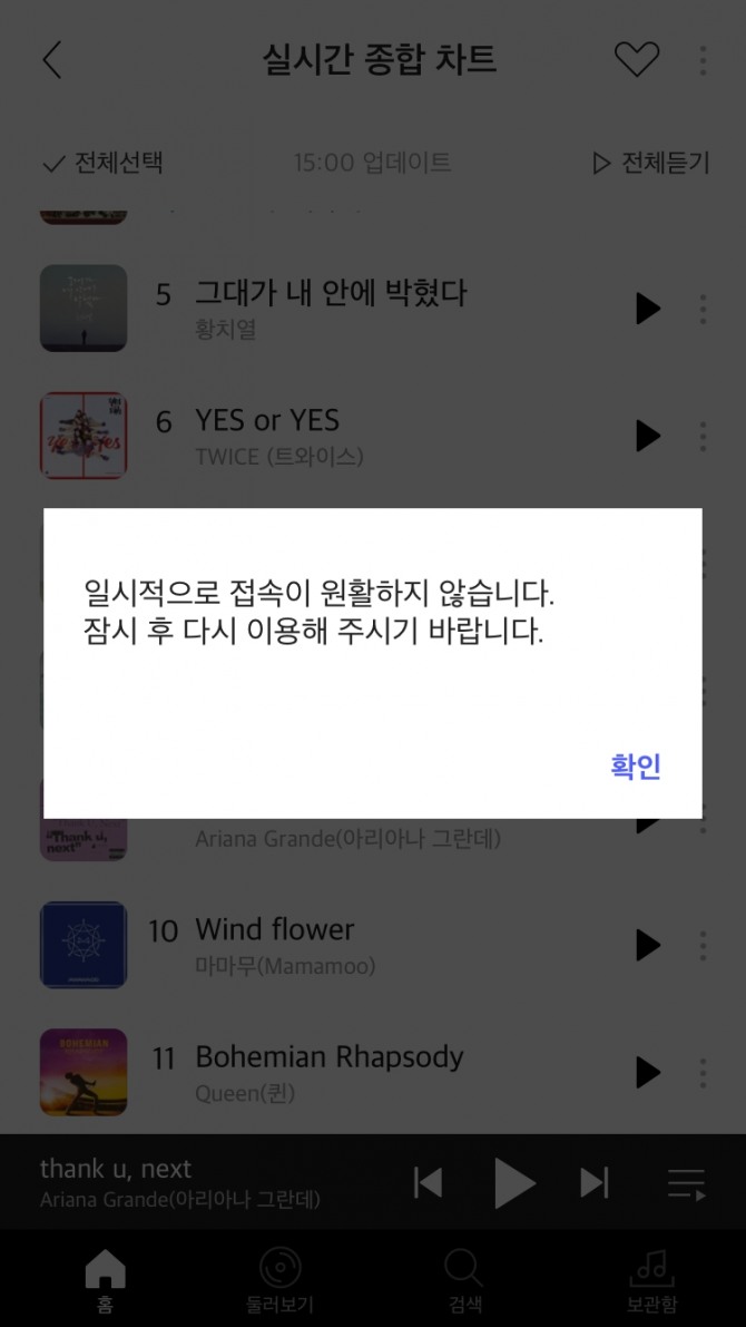 이미지 확대보기13일 SK텔레콤의 음악 플랫폼 '플로'가 "일시적으로 접속이 원활하지 않습니다. 잠시 후 다시 이용해 주시기 바랍니다."라는 문구와 함께 지속적인 끊김 현상을 보이고 있다.