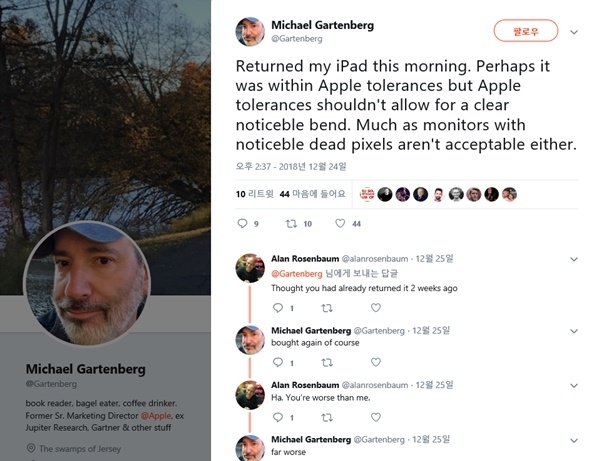 지난 24일(현지시각) 휘어진 아이패드를 구입했다는 마이클 가텐버그 애플 전 수석 마케팅 이사가 공개 언급한 내용의 일부다. 그는 “애플은 분명하게 눈에 띄는 (아이패드프로의) 휘어짐을 허용할 정도로 인내심(또는 넉넉한 제품 허용오차)을 발휘해서는 안된다“고 말했다.