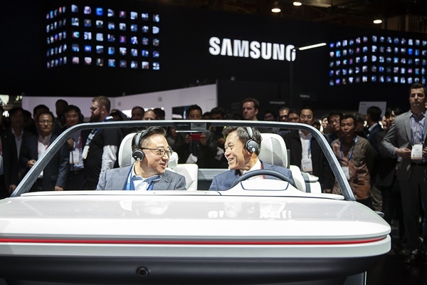 이미지 확대보기박정호 SK텔레콤 사장(오른쪽)이 8일 오전(현지시각) CES 2019 전시장 내 삼성전자 부스에서 고동진 삼성전자 사장과 함께 '디지털 콕핏(Digital Cockpit) 2019'를 체험하고 있는 모습(사진=SK텔레콤)