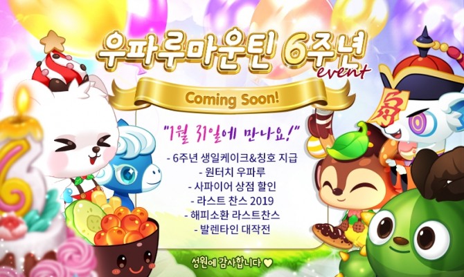 또 ▲2016년~2017년에 출시되었던 리치몽, 다이아, 여월, 흑여월, 유니핀 등의 한정 우파루를 다시 소환 가능한 ‘라스트 찬스’ 이벤트 ▲해피소환위크 이지모드 우파루를 획득할 수 있는 ‘해피소환위크 라스트 찬스’ 이벤트 ▲미션 달성 시 발렌타인 한정 우파루를 지급하는 ‘6주년 기념 발렌타인 대작전’ 이벤트 ▲설날을 맞아 출시한 ‘진도 우파루'를 소환하면 보석 보상을 지급하는 이벤트 등이 준비돼 있다.