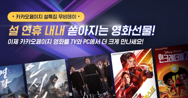 카카오페이지 관계자는 “매년 명절마다 이용자들이 가장 기다리고 기대하는 선물이 될 수 있도록 ‘무비 데이’를 지속적으로 진행할 것”이며 “2월부터는 이용자들의 편리성을 높이고 국내 주요 지상파 예능·드라마 선물 이벤트도 선보일 것”이라고 향후 계획을 밝혔다.