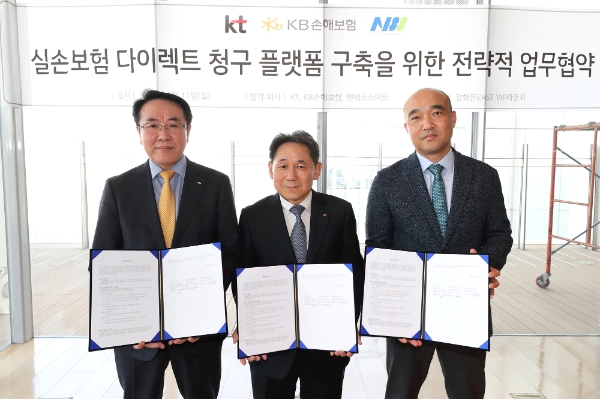 이미지 확대보기KT가 11일 KB손해보험, 엔에스스마트와 ‘실손의료보험 다이렉트 청구사업’을 위한 업무협약을 서울 광화문 이스트 사옥에서 체결했다고 밝혔다. 왼쪽부터 김경선 KB 손해보험 상품총괄, 이필재 KT 마케팅부문장, 김진우 엔에스스마트 대표이사.(사진=KT)[글로벌이코노믹 이재구기자 오혜수 인턴기자] KT(회장 황창규)가 11일 KB손해보험, 엔에스스마트와 손잡고 ‘실손의료보험 다이렉트 청구사업’을 위한 업무협약을 체결했다고 밝혔다. 다이렉트 청구 서비스는 다음달 선보일 계획이다.