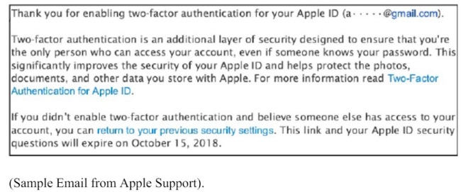 소장에 따르면 원고 브로드스키는 이중인증에 오랜 시간이 걸리고 애플의 이중인증 확인 메일의 내용도 충분치 않다고 주장했다. 그가 제시한 내용을 보면 사용자가 이중인증을 해지할 수 있는 기간은 단 2주에 불과하며, 그나마 이 사실을 공지한 내용은 메일 마지막 한 문장에 들어있다.