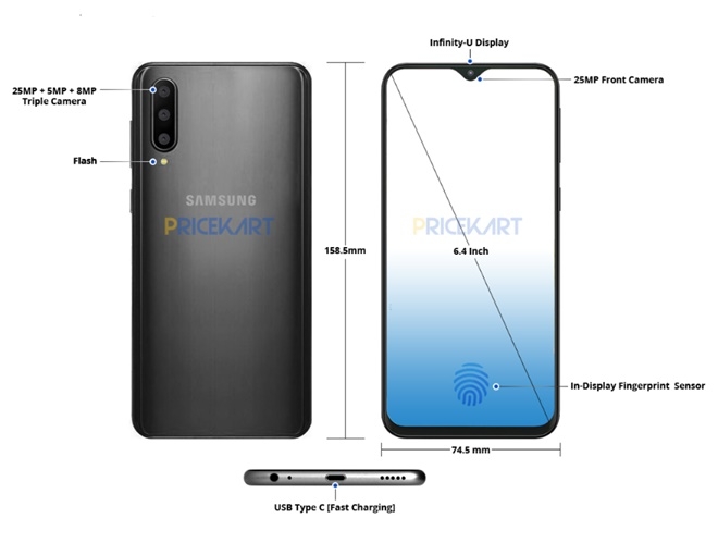 유출된 렌더링 사진을 보면 갤럭시A50은 화면내장형(인디스플레이) 지문센서, C타입 USB 및 3.5mm 오디오잭 포트를 갖추고 있음을 알 수 있다. 또한 바닥에는 작은 마이크와 함께 스피커가 보인다.