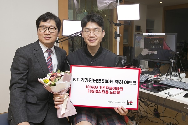 KT는 이번 기가인터넷 가입자 500만 돌파를 기념해 다양한 이벤트를 진행했다. 1인 미디어 생태계 환경 구축에 앞장서고 있는 KT는 500만 돌파 이후 가장 먼저 10기가(10GiGA) 인터넷에 가입한 방송 크리에이터에게 10GiGA 1년 무료이용권 및 10GiGA 전용 노트북을 제공했다.
