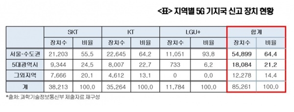 이미지 확대보기7일 변재일 의원(국회 과학기술정보통신위·더불어민주당)이 과학기술정보통신부로부터 제출받은 '5G 기지국 신고 장치 현황'에 따르면 4월 3일 기준 전국 17개 시·도에 설치된 8만 5261개 기지국 장치 중 85.6%인 7만2983개가 서울·수도권과 5대 광역시에 설치된 것으로 나타났다.