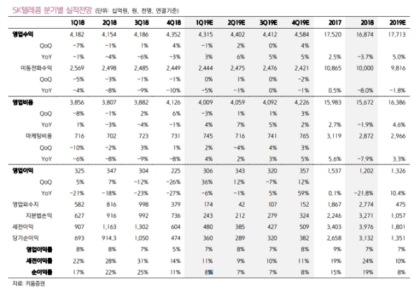 통신사업에서는 무선수익 2조4440억원(0%,-5%)로 무선 가입자당매출(ARPU)의 하락요인에 따른 매출 감소세가 지속될 것이라는 분석이다.