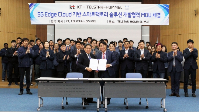 이미지 확대보기KT는 텔스타홈멜과 경기도 평택시 텔스타홈멜 사옥에서 ‘5G Edge Cloud 기반 스마트팩토리 솔루션 개발협력 MOU’를 체결했다고 19일 밝혔다.