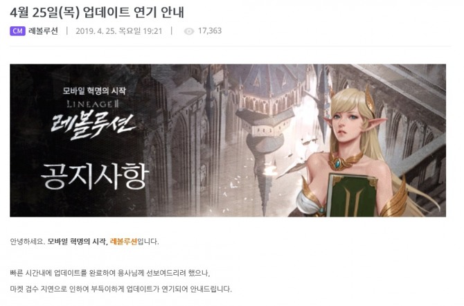 이미지 확대보기25일 넷마블은 리니지2 레볼루션 공식 커뮤니티를 통해 "마켓 검수 지연으로 인해 부득이하게 업데이트가 연기됐다"고 공지했다.