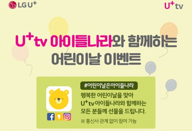 아이들나라를 시청하고 있는 아이, 부모, 조부모, 반려동물 사진 모두 가능하며 이용 중인 통신사 관계없이 참여할 수 있다. U+tv 아이들나라 시청 사진을 찍고 ‘#어린이날은아이들나라’ 해시태그와 함께 인스타그램, 페이스북, 카카오스토리 중 한 곳에 5월 6일까지 업로드하면 된다. 참여 완료 고객 전원에게 초콜릿 교환권을 제공한다.