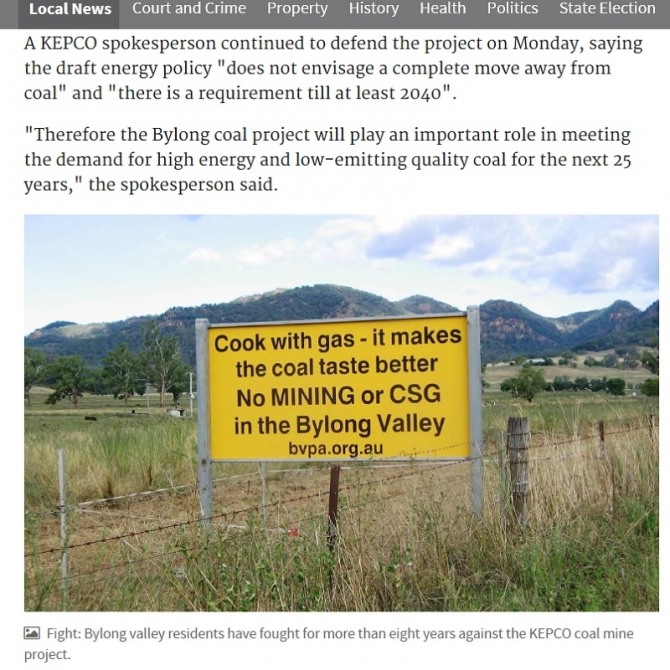 호주 언론 더뉴캐슬헤럴드는 29일(현지시간) "뉴사우스웨일스 주(州)의 에너지업계와 연구기관들은 한전이 7억 달러(약 8120억원)을 투자해 최종 개발허가를 앞두고 있는 바이롱 밸리(Bylong Valley)의 바이롱 석탄광산 개발사업에 의문을 제기하고 있다"고 보도했다.