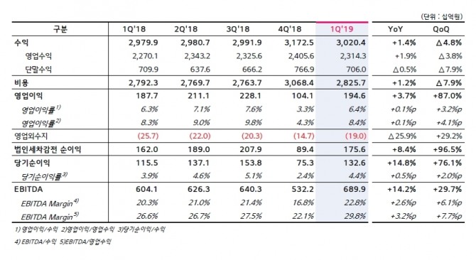 무선수익은 전년 동기보다 0.8% 증가한 1조3447억 원을 기록했다. 선택약정 가입자 비중과 결합가입자 증가 등 수익 감소 요인에도 1분기 총 순증 가입자가 27만명을 기록하면서 수익 감소 영향을 줄였다. 가입자 해지율도 1.5% 수준까지 낮아졌다.