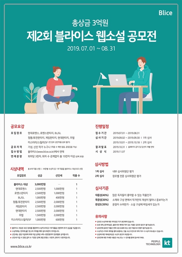 이미지 확대보기KT(회장 황창규)가 총상금 3억원의 상금을 내걸고 웹소설을 모집한다. KT는 자사가 운영하는 웹소설 플랫폼 ‘블라이스’이름을 딴 제2회 블라이스 웹소설 공모전을 개최한다고 9일 밝혔다.