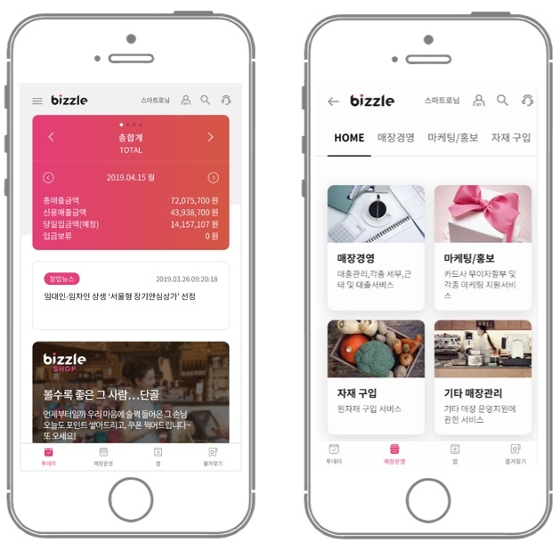 9일 스마트로에 따르면, 매장 매출 정보와 결제, 단골 관리 서비스 앱 ‘비즐(BIZZLE)’이 지난 6일 출시됐다. 비즐은 가맹점주들에게 매출 증가에도 도움이 될 수 있는 20여개의 영업/매장 관리 서비스를 한 번에 통합 관리할 수 있도록 만들어진 앱이다. 앱은 카드사 가맹점 등록이 되어있는 사업자라면 누구나 앱스토어나 플레이스토어 등을 통해 다운받아 이용할 수 있다.
