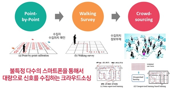 이미지 확대보기KAIST는 이 대학 한동수 전산학부 교수팀(지능형서비스통합 연구실)이 크라우드소싱 기반의 실내 위치 인식 기술을 개발했다고 10일 발표했다. 크라우드소싱이란 불특정 다수의 사람 혹은 기기로부터 데이터를 대량으로 모으는 행위 또는 방법을 말한다.