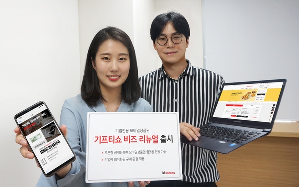 이미지 확대보기KT엠하우스는 최근 개인 선물 용도 외에도 기업의 이벤트 경품이나 직원 복지 용도로 폭 넓게 활용되는 점에서 착안해 이번 개편을 단행했다. KT엠하우스의 자체 조사에 따르면, 2018년 전체 모바일상품권 시장은 2조 7000억원 규모로 그 중 40%는 기업들이 구매했다.