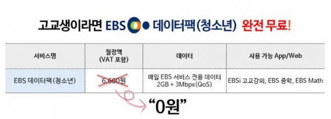 이번 ‘EBS 데이터팩 0원 프로모션’ 실시에 따라 대한민국 고교생인 SK텔레콤 고객은 누구나 오는 다음달 1일부터 오는 12월 31일까지 ‘EBS 데이터팩(청소년)’ 이용료(월 6600원, VAT 포함)를 전액 지원받을 수 있게 됐다. SK텔레콤과 과학기술정보통신부는 고교생들의 부담을 덜어주기 위해 이용료를 절반씩 맡아 지원하기로 했다.