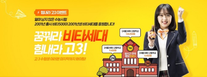 이미지 확대보기광동제약이 ‘꿈꿔라 비타세대, 힘내라 고3!’ 캠페인을 전개한다. 캠페인은 ‘비타500’ 출시 해인 2001년에 태어난 학생들이 수능을 치르게 되는 올해 수험생을 응원하기 위해 마련됐다.