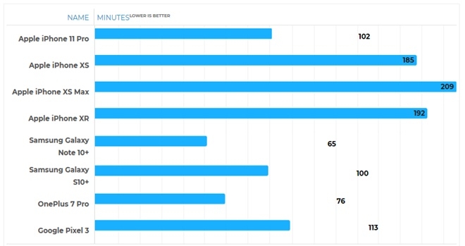 지난달 20일 발표된 삼성 갤럭시노트10시리즈, 지난10일 발표된 애플 아이폰11시리즈 등을 포함한 최신 스마트폰 급속충전 완전충전 시간 확인결과 ▲1위는 삼성전자 갤럭시노트10플러스(65분) ▲2위는 원플러스7프로(76분) ▲3위는 삼성 갤럭시S10플러스(100분) ▲4위는 애플 아이폰11프로(102분) ▲5위는 구글 픽셀3(113분) ▲6위는 애플 아이폰XS(185분) ▲7위는 아이폰XR(192분) ▲8위는 아이폰 XS맥스(209분) 순이었다. 20일 발표된 메이트30시리즈는 대상에 없었다.