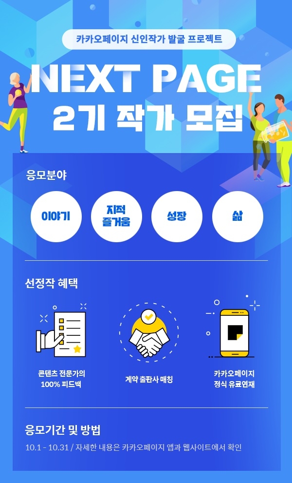 이미지 확대보기카카오페이지(대표 이진수)는 1일 ‘넥스트 페이지(NEXT PAGE)’ 공모전 2기 작가를 모집한다고 밝혔다. 문학, 실용, 교양만화까지 전 분야를 포괄하는 공모전으로, 모집 분야는 ▲이야기(소설, 에세이, 논픽션 등 내가 주목하는 흥미로운 이야기) ▲지적 즐거움(역사, 심리, 철학 등 사람과 사회를 이해하는 새로운 시선) ▲성장(공부법, 스피치, 재테크, 운동법 등 나만의 노하우) ▲삶(관계, 자존감, 연애 등 확실한 행복을 위한 태도와 경험 공유) 등 크게 네 가지다.