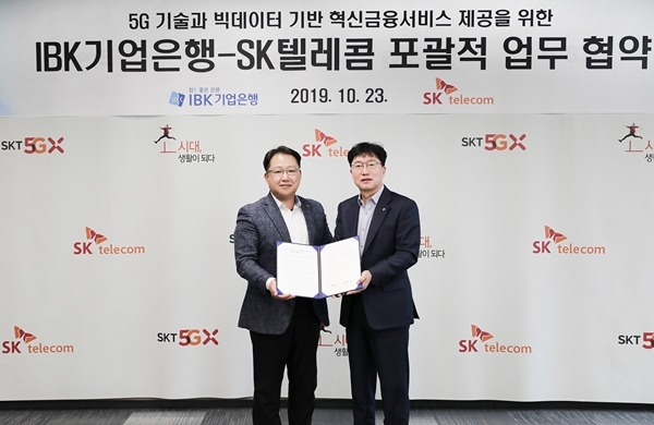 이미지 확대보기SKT는 IBK기업은행과 서울 종로구 센트로폴리스에 있는 SK텔레콤 5G 스마트오피스에서 5G 기술과 빅데이터 기반 혁신금융서비스 창출을 위한 업무협약을 체결했다고 23일 밝혔다.