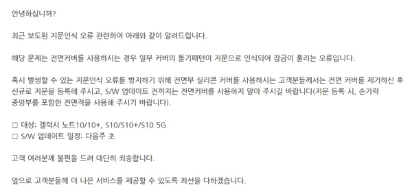 이는 한 해외 네티즌의 발견으로 외신들이 삼성전자가 갤럭시S10과 갤럭시노트10 등 삼성전자의 프리미엄 스마트폰에서 지문인식 오류를 발견하면서 시작됐다.