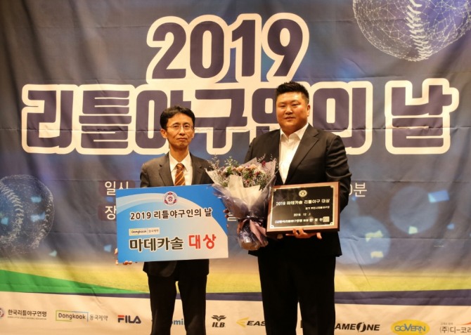이미지 확대보기리틀야구인의 날은 한 해 동안 리틀야구 발전에 공헌한 우수팀과 지도자, 선수들을 격려하기 위해 마련된 행사다. 동국제약은 지난 1일 경기도 평택 라마다평택 호텔에서 열린 행사에서 '마데카솔 대상' 1개팀(경기 부천시)과 '마데카솔 모범상' 2개팀(서울 동대문구, 대구 중구)을 시상했다.